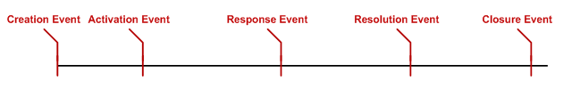 The Issue Lifecycle is defined by five "events": Creation, Activation, Response, Resolution, and Closure. The workspace administrator defines in which of these portions of the Issue Lifecycle each of the issue statuses falls. For example, the Open status might be defined as falling during the Creation period, which is before Activation. A status of "Assigned" might be defined as falling during the Activation period but before the Response. A status that indicates an issue as having been Responded to by the agent (Agent Responded) can be defined under the Response Event.