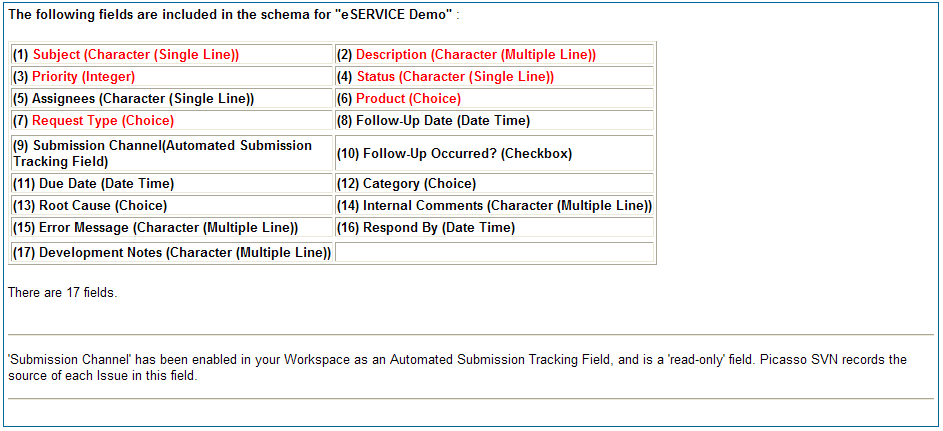 As an example, suppose the workspace has several custom Workspace fields, called Category, Device/Application, Symptom, Error Message, Platform, and Follow-up Date. The Schema would look like this:
